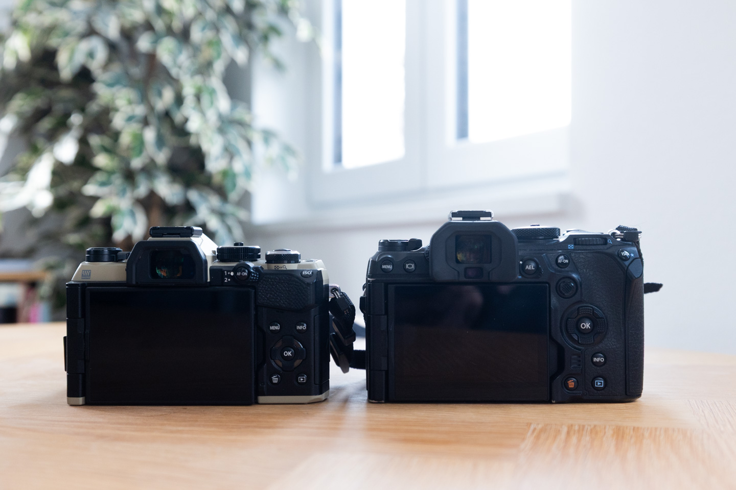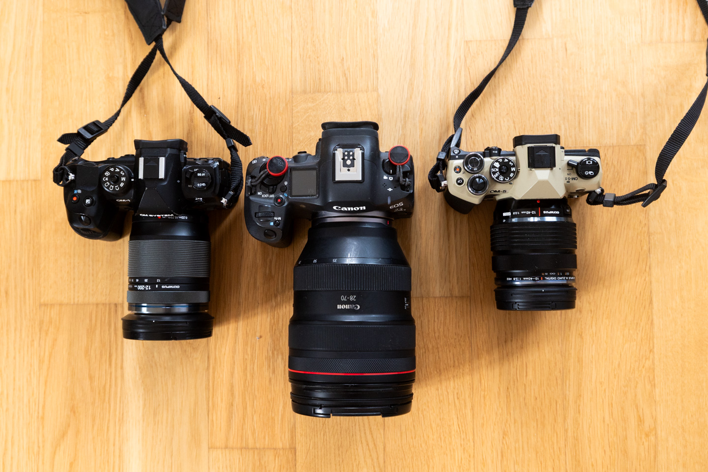 Aus dieser Top-Down-Perspektive wird der extreme Größenunterschied zwischen Vollformat und Micro-Four-Thirds-System noch einmal deutlicher. Links die OM System OM-1 Mark II, in der Mitte die Canon R5 Mark II und rechts die OM System OM-5 Mark II.