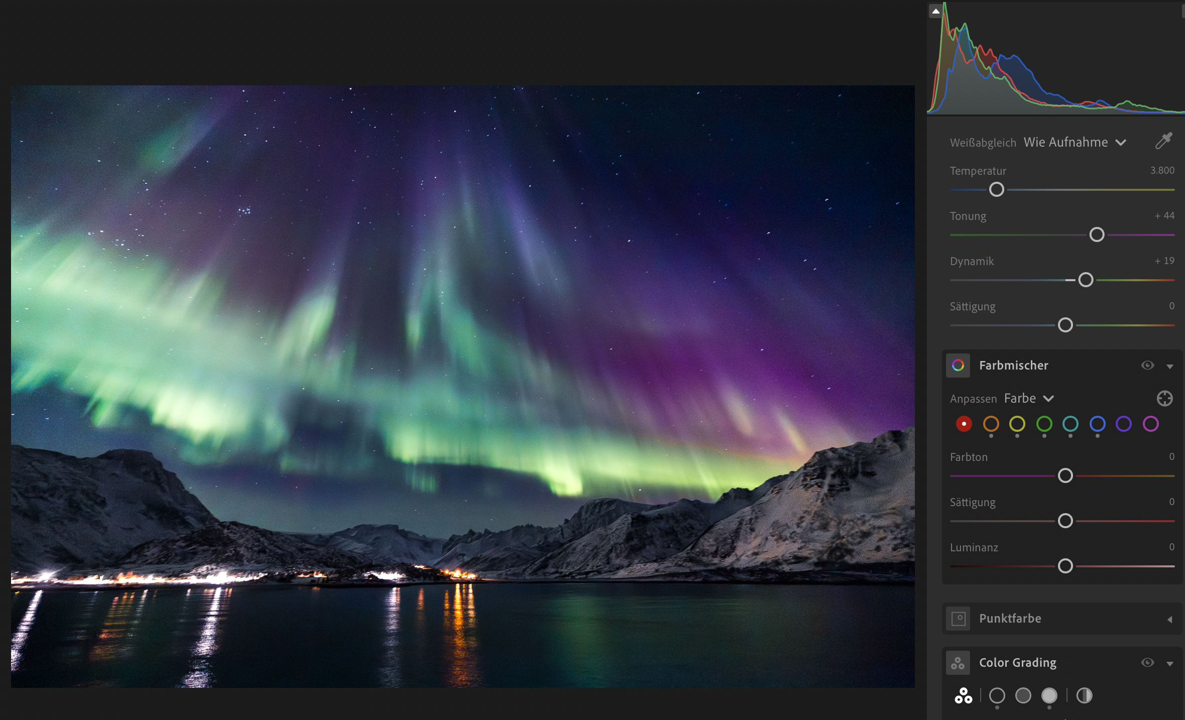 In der Regel arbeite ich zunächst mit dem Weißabgleich. Wenn du den Regler dafür einfach mal stärker in die kalte und die warme Richtung bewegst, bekommst du schnell ein gutes Gefühl dafür, welcher Bereich natürlich aussieht und sich für dein Foto anbietet. Du willst Extreme auf jeden Fall vermeiden, denn vor allem wenn man das Glück hat und viele Nordlichtfarben auf einmal sieht, verliert man diese schnell bei einem unnatürlichen Weißabgleich.