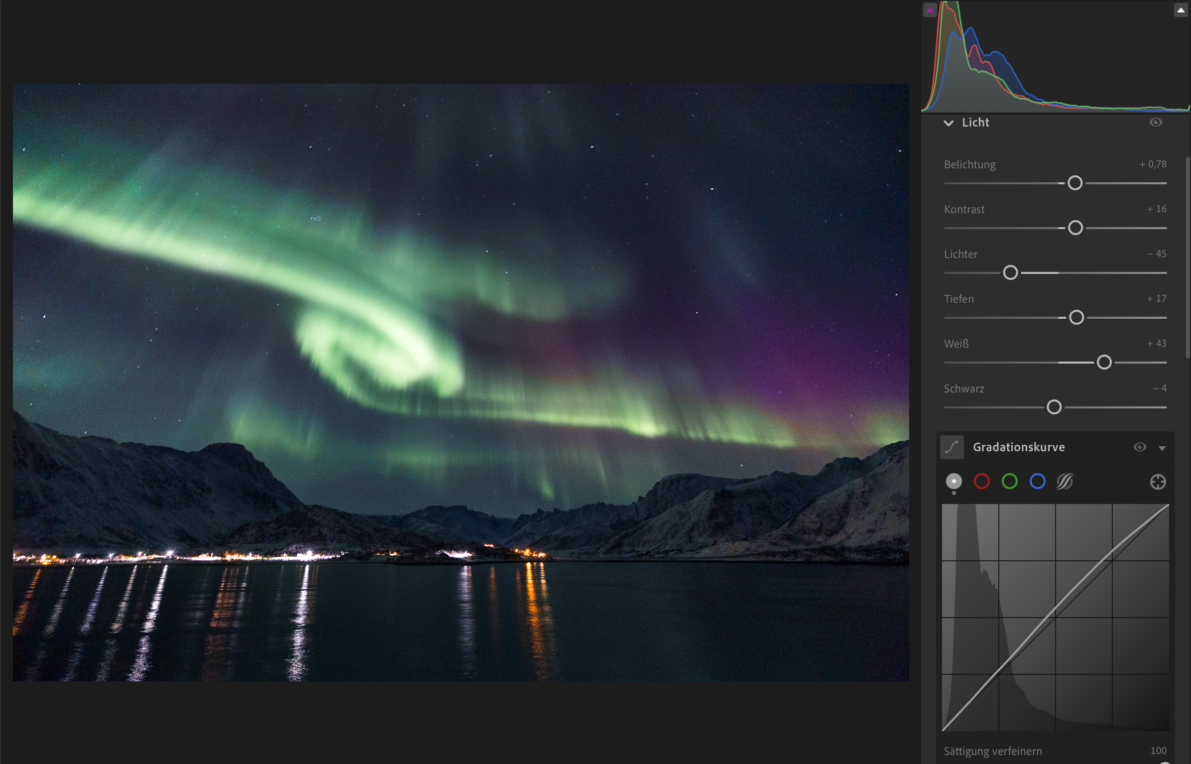 Mit moderaten Kontrastanpassungen kannst du die Strukturen der Nordlichter noch deutlich besser betonen. Ich nutze dafür jedoch nicht den Kontrastregler direkt, da er auch die Farben im Bild verändert. Versuche stattdessen mithilfe der Lichter und Tiefen sowie der Weiß- und Schwarzregler einen guten Kontrast ins Bild zu bekommen. Alternativ kannst du die Gradationskurve nutzen und die typische „S-Form“ verwenden.