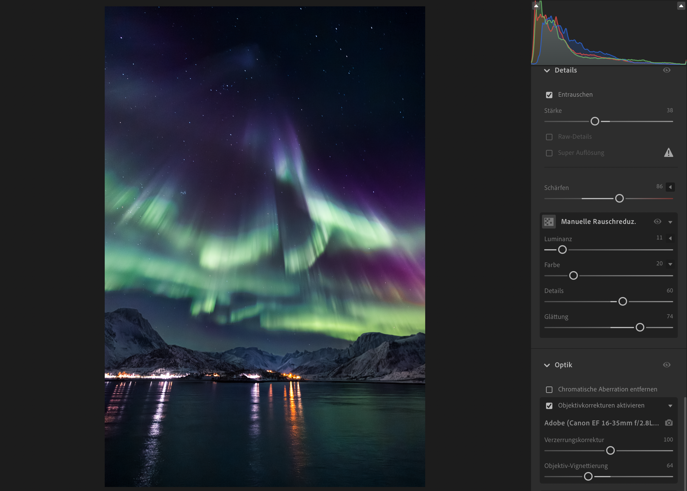 Was die Farben angeht, muss man direkt betonen: Nordlichter sind empfindlich! Wenn du zu sehr das Grün in Gelb oder das Rot in Orange ziehst, sieht man das super schnell im finalen Foto, denn die natürlichen und weicheren Übergänge zwischen den verschiedenen Polarlichtern werden dann härter und Farben wechseln abrupter, was unnatürlich aussehen kann.