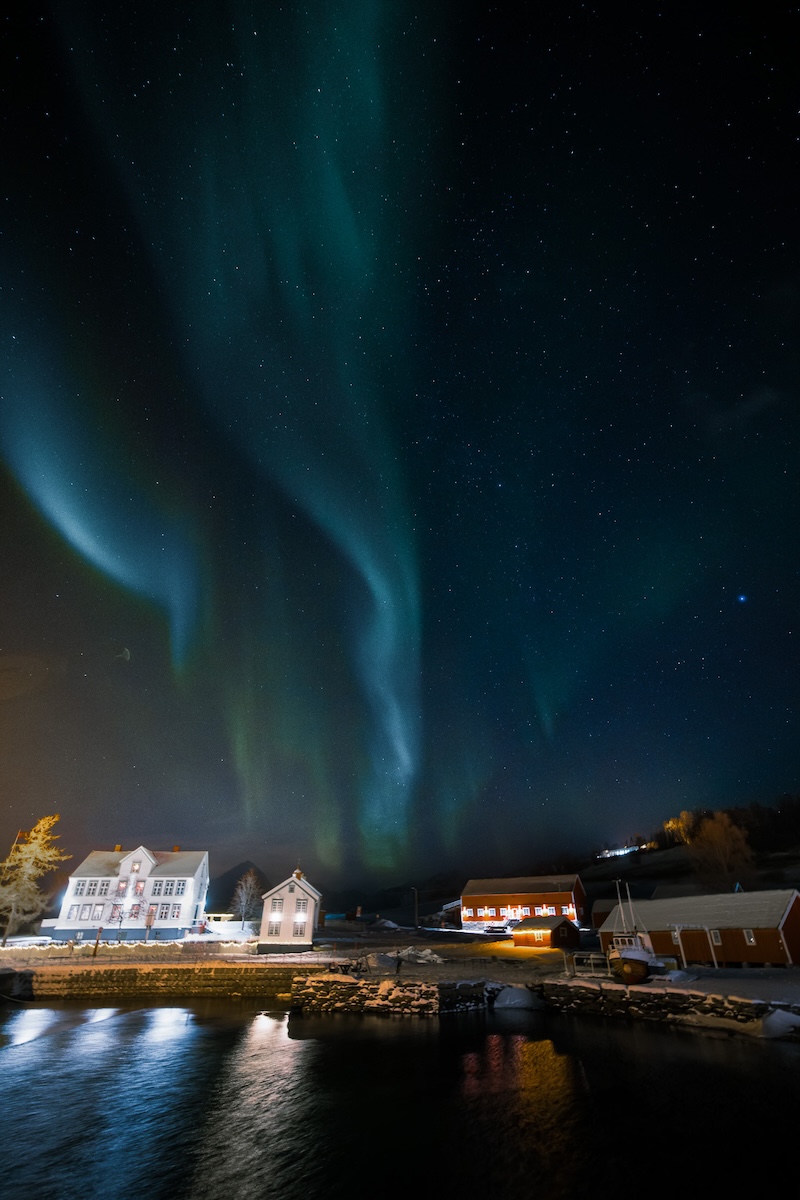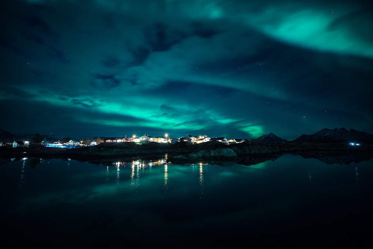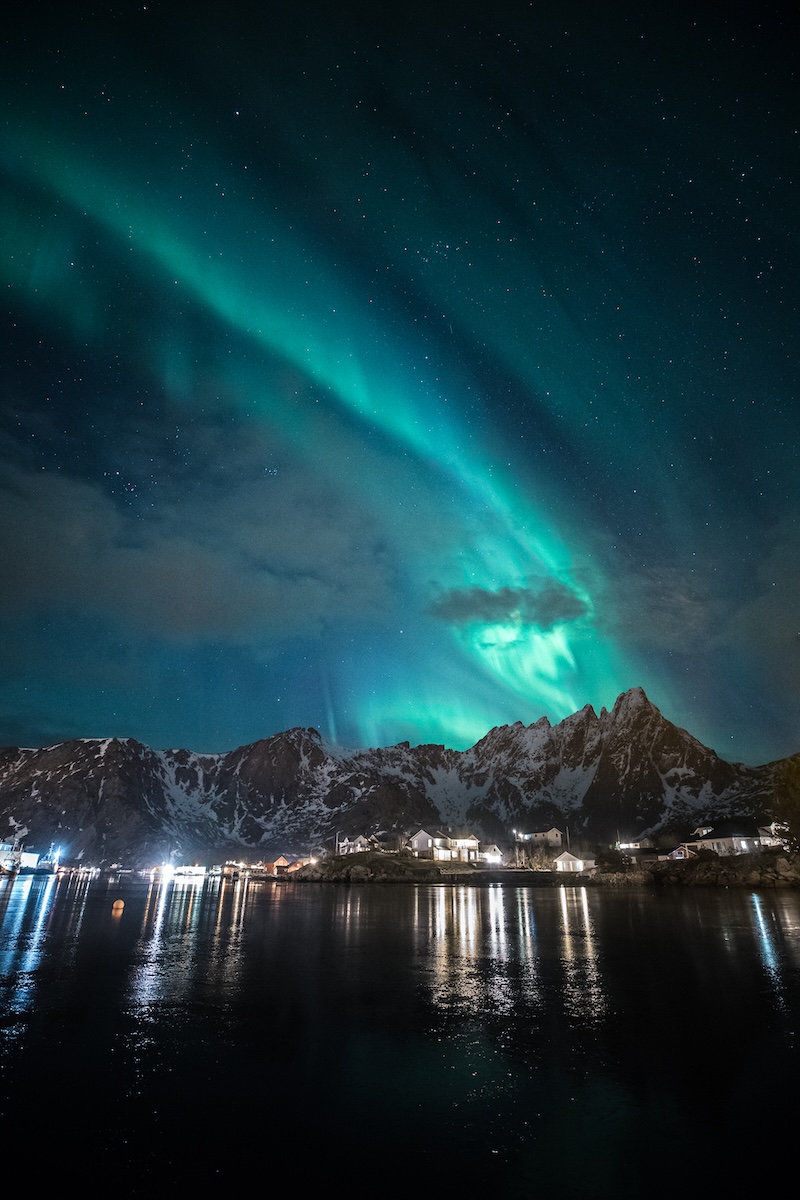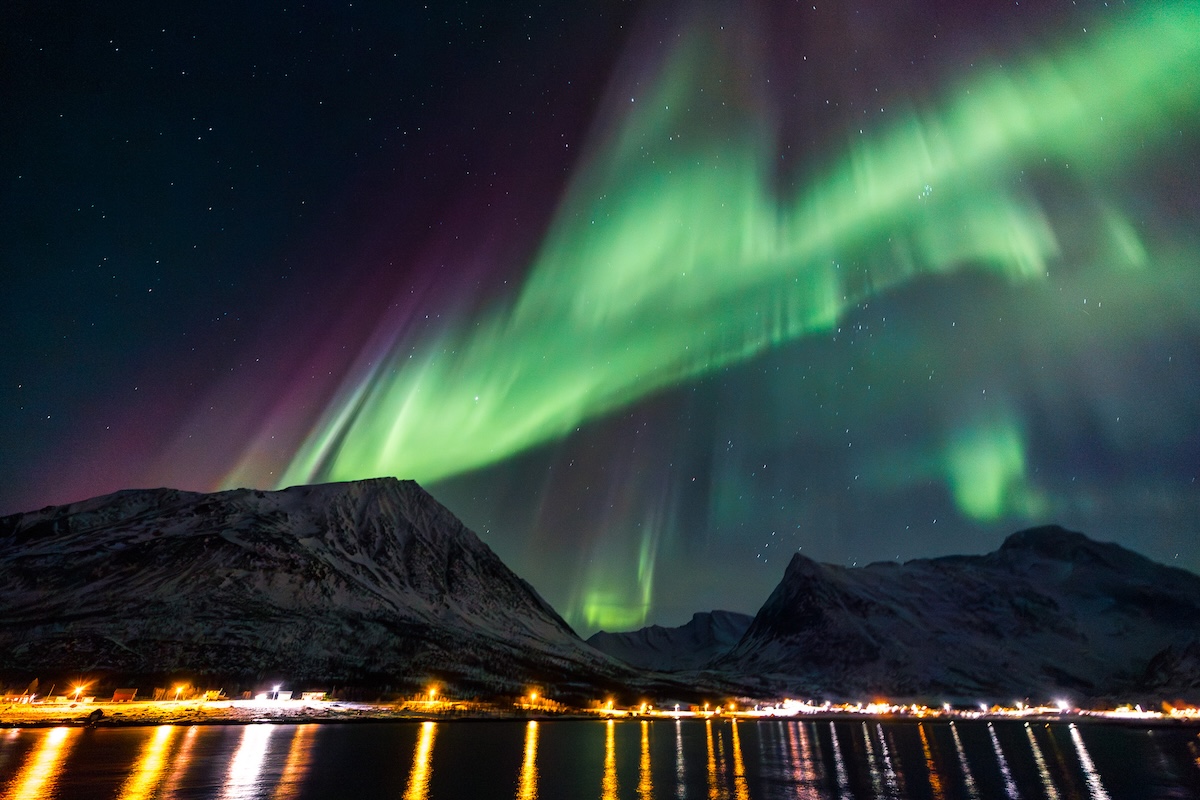 Subjekte wie Bergketten und Dörfer lassen die Polarlicht-Fotos nochmal spannender aussehen.